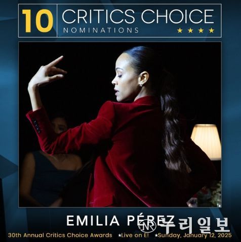(누리일보) 카를라 소피아 가스콘, 조 샐다나, 셀레나 고메즈가 주연을 맡고, 자크 오디아르 감독이 연출을 맡은 뮤지컬 영화 '에밀리아 페레즈'가 골든글로브 어워즈 10개 최다 후보에 오른 것에 이어 제30회 크리틱스 초이스 어워즈에서도 10개 후보로 지명돼 화제를 이어간다.온라인 영화 스트리밍 서비스