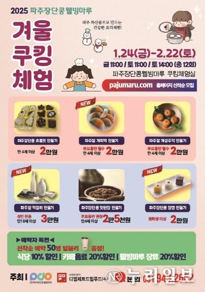 (누리일보) 파주시 출자기관인 ㈜파주장단콩웰빙마루(이하 ‘웰빙마루’)는 파주 특산물을 활용하여 다양한 체험을 할 수 있는 ‘2025 겨울쿠킹체험’의 참여자를 모집한다.