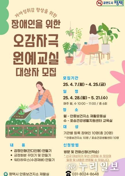 (누리일보) 평택시 안중보건지소는 지역사회 장애인을 대상으로 ‘장애인을 위한! 오감자극 원예교실’ 프로그램을 4월 28일부터 5월 21까지 매주 월·수요일 오전 10:00~11:00에 운영할 예정이다.