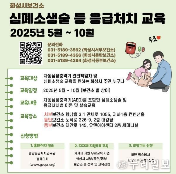 (누리일보) 화성특례시가 시민과 공공·민간 시설 관리 책임자 등을 대상으로 2025년 심폐소생술 등 응급처치 교육을 운영한다.