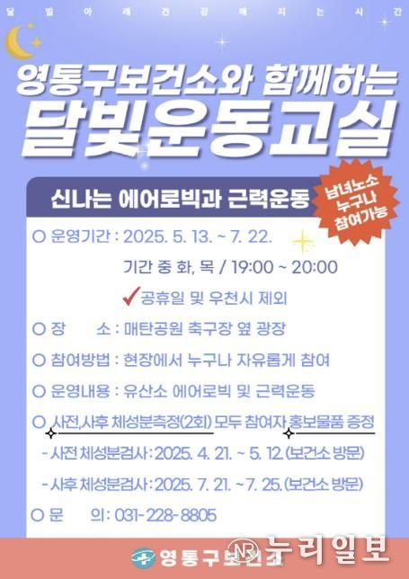 (누리일보) 수원 영통구보건소가 야간 운동 프로그램 ‘달빛운동교실’에 참가할 지역 주민 50명을 5월 9일까지 모집한다.