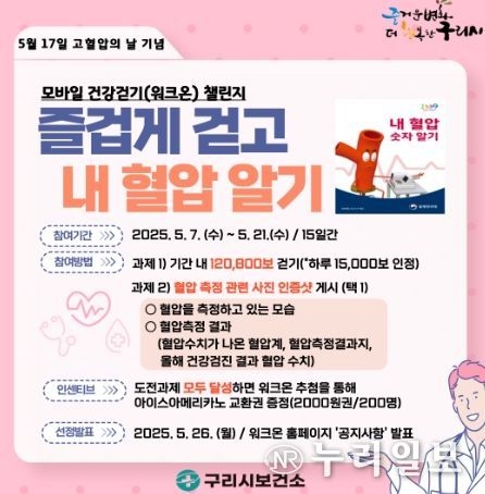(누리일보) 구리시는 고혈압의 날인 5월 17일을 맞아 시민들의 심혈관 건강 증진을 위한 ‘즐겁게 걷고, 내 혈압 바로 알기 챌린지’를 오는 7일부터 21일까지 15일간 진행한다고 밝혔다.