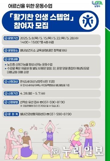 ‘활기찬 인생 스텝업’은 남양주풍양보건소 별내건강생활지원센터 운동사가 진행하며, 노인 신체 연령에 맞춘 근력·밸런스 운동 등의 내용으로 매주 1회 오후 2시부터 3시까지 총 4회 운영된다.