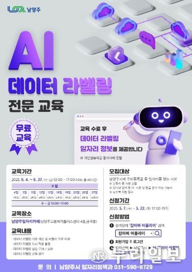 (누리일보) 남양주시는 오는 7일부터, 시민들의 디지털 산업 분야로의 취업 성공을 지원하기 위해 ‘AI 데이터 라벨링 전문 교육’을 모집한다고 2일 밝혔다.