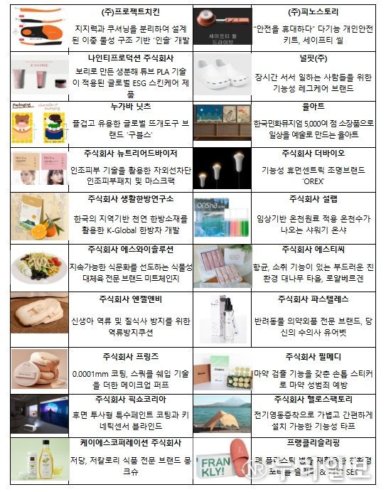 통합 최우수상에는 양치를 싫어하는 반려동물을 위해 분사형 스프레이 타입의 반려동물 구강 관리 제품을 개발한 ‘㈜파스텔레스(경기 용인)’가 선정됐고, 버려지던 서산 감태를 원료로 후레이크, 캬라멜, 페스토 등 다양한 가공식품을 개발한 ‘㈜기린컴퍼니(충남 서산)’, 전통 민화를 활용하여 1,300여종의 제품을 개발한 ‘율아트(전남 강진)’가 각각 로컬브랜드, 라이프스타일 분야의 최우수 기업으로 선정됐다.