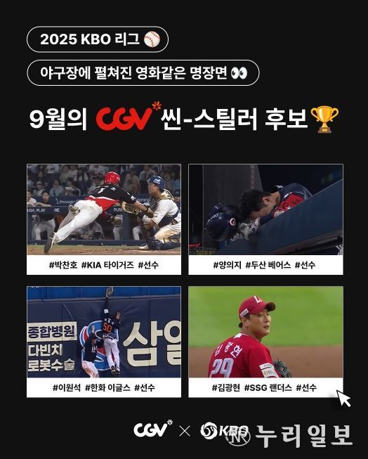 (누리일보) KBO와 CGV가 공동 제정한 ‘월간 CGV 씬-스틸러상’의 9월 수상자 후보로 KIA 박찬호, 두산 양의지, 한화 이원석, SSG 김광현 등 총 4명의 선수가 선정됐다.