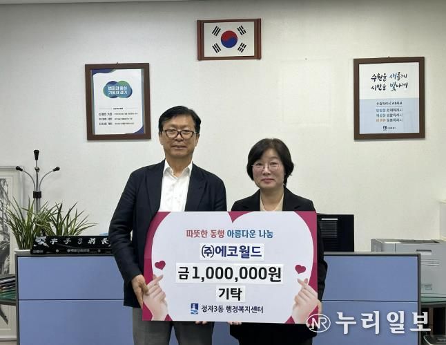 (누리일보) 주식회사 에코월드는 지난 29일, 추석 명절을 앞두고 수원시 장안구 정자3동에 이웃돕기 성금 100만원을 기탁했다. 이번 기부금은 명절을 맞아 도움이 필요한 우리 이웃들에게 소중히 전달될 예정이다.