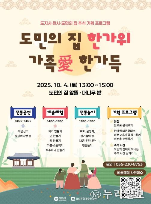 (누리일보) 경상남도는 10월 4일 오후 1시부터 3시까지 도심 속 복합문화공간 활성화를 위해 추석을 맞아 귀향객과 도민이 함께 즐길 수 있는 기획 프로그램 ‘도민의 집 한가위, 가족愛 한가득’을 개최한다고 밝혔다.