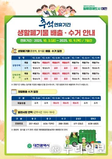 (누리일보) 대전시는 민족 최대 명절인 추석을 맞아 시민들이 쾌적한 환경에서 연휴를 보낼 수 있도록 생활쓰레기 관리대책을 마련해 시행한다고 2일 밝혔다.