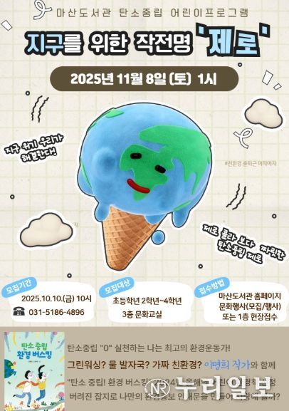(누리일보) 김포시 마산도서관에서 오는 11월 8일 오후 1시부터 3시까지, 초등학교 2학년~4학년 어린이를 대상으로 탄소중립 어린이 프로그램 책풍당당 '지구를 위한 작전명 ‘제로’'를 운영한다.