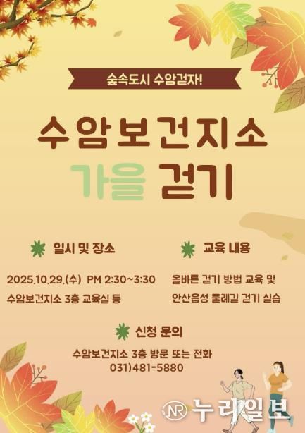 (누리일보) 안산시 상록수보건소 수암보건지소는 지역 주민의 건강증진을 도모하기 위해 ‘수암 가을 걷기 교실’ 참가자를 모집한다고 14일 밝혔다.
