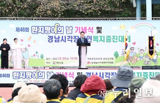 (누리일보) 경남도는 22일 오전 창원스포츠파크 보조경기장에서 열린 ‘제46회 흰 지팡이의 날 기념식’에서 “흰 지팡이는 시각장애인의 자립과 성취, 평등한 사회 참여를 상징한다”며 “오늘이 더불어 살아가는 사회를 위해 흰 지팡이의 의미를 알리는 날이 되길 바라며, 시각장애인의 권익과 복지 증진에 힘쓰겠다”고 밝혔다.