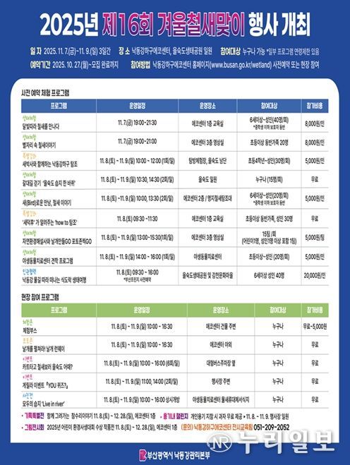 (누리일보) 부산시 낙동강관리본부는 오는 11월 7일부터 11월 9일까지 3일간 을숙도생태공원에서 '제16회 겨울철새맞이 행사'를 개최한다고 밝혔다.