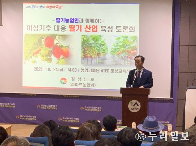 (누리일보) 경상남도는 24일 도 농업기술원 ATEC 영상교육장에서 ‘이상기후 대응 딸기 산업 육성 토론회’ 를 개최하고, 지구 온난화로 인한 폭염, 극한호우 등 이상기후에 대응하기 위한 딸기 산업의 지속 가능 방안에 대해 논의했다고 밝혔다.