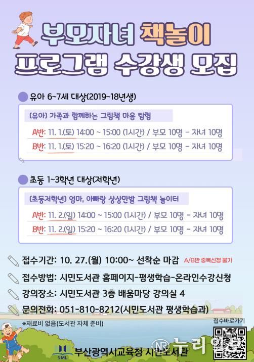 (누리일보) 부산광역시립시민도서관은 다음달 1일부터 이틀간 시민도서관 배움마당 강의실에서 학부모와 자녀 80명을 대상으로 ‘하반기 부모자녀 프로그램’을 운영한다.