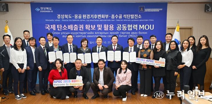 (누리일보) 경북도는 27일 에이펙(APEC)이 열리고 있는 경주엑스포대공원 회의실에서 몽골 환경기후변화부, 에너지부, 울란바타르시가 참여한 가운데 탄소배출권 사업 등에 대한 업무협약(MOU)을 체결했다.