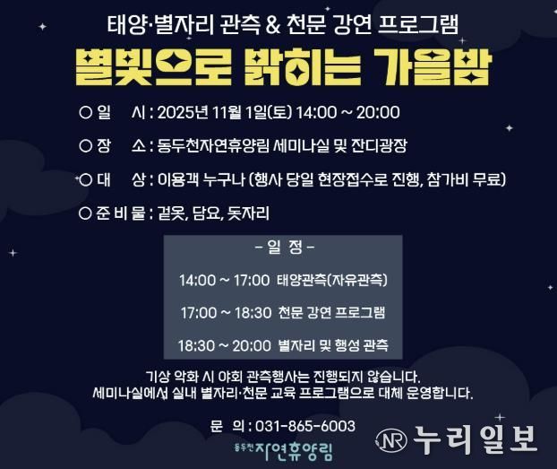 (누리일보) 동두천시시설관리공단은 오는 11월 1일 동두천자연휴양림에서 가을밤 하늘을 배경으로 별자리와 행성을 함께 관측하는 '천문행사 ‘별빛으로 밝히는 가을밤’'을 개최한다.