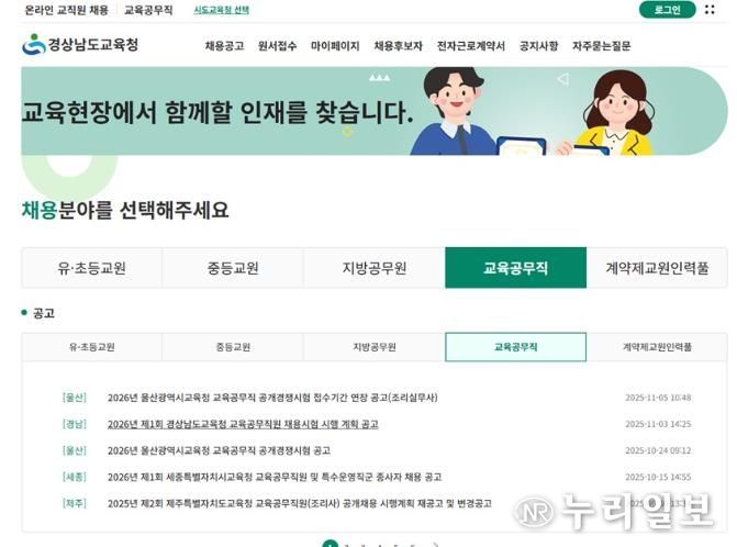 (누리일보) 경상남도교육청은 11월 3일 경상남도교육청과 교육지원청 누리집에서 ‘2026년 제1회 교육공무직원 채용시험 시행계획’을 공고했다.