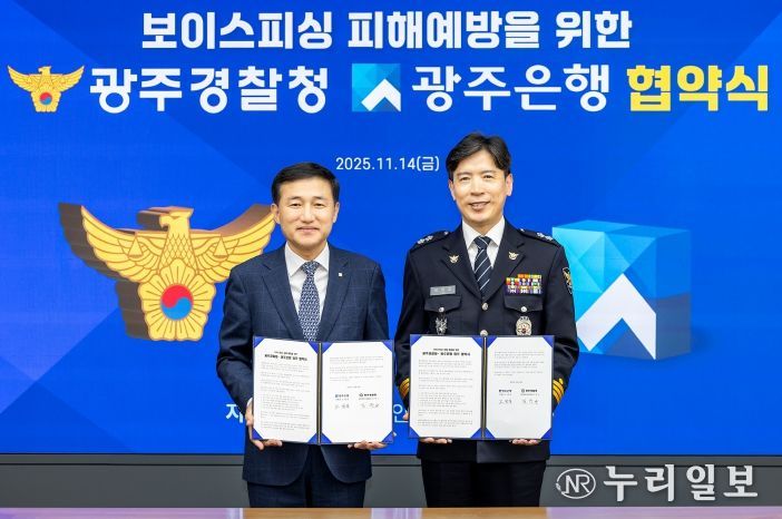 (누리일보) 광주은행은 14일, 광주경찰청과 ‘보이스피싱 피해 예방을 위한 업무협약(MOU)’을 체결했다고 밝혔다.