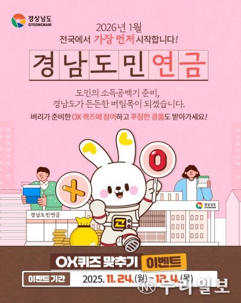 장수환 경상남도 홍보담당관은 “경남도민연금은 도민의 든든한 노후를 위한 새로운 안전망의 첫걸음”이라며, 이번 퀴즈를 통해 핵심 내용을 쉽고 재미있게 접하길 바란다”고 말했다. 이어 “퇴직 후 소득 공백기에 도민들이 안정적인 생활을 이어갈 수 있도록 경남도민연금에 많은 관심과 참여를 부탁드린다”고 덧붙였다.