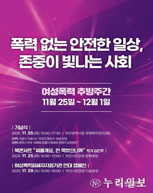 (누리일보) 부산시는 내일(25일)부터 12월 1일까지 '2025 여성폭력 추방주간'을 운영한다고 밝혔다.