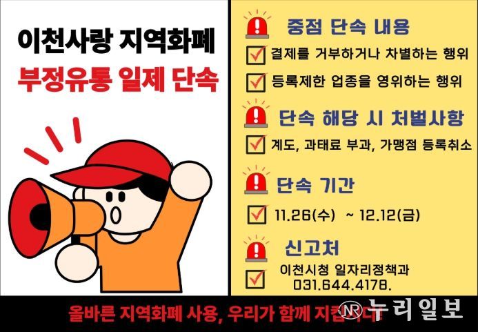 (누리일보) 이천시는 경기이천사랑지역상품권의 올바른 사용 환경을 조성하고 건전한 유통 질서를 확립하기 위해 11월 26일부터 12월 12일까지 지역사랑상품권 부정유통 근절을 위한 일제 단속을 추진한다고 밝혔다.