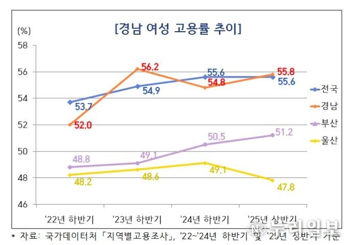 국가데이터처가 발표한 ‘2025년 상반기 지역별고용조사’ 결과에 따르면 경남 여성 고용률은 55.8%로 전국 평균(55.6%)보다 높으며, 동남권인 부산(51.2%), 울산(47.8%)과 비교해도 가장 높은 수치를 보였다.