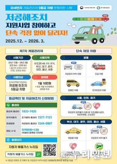 단, ▲긴급 ▲장애인 표지 부착 ▲저공해 조치 완료 차량 등은 단속 대상에서 제외된다. 만약 적발되더라도 2026년 9월 30일까지 저공해 조치를 완료할 경우 과태료를 면제받을 수 있다.