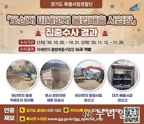 (누리일보) 경기도는 도심지 미세먼지 발생사업장 330개를 대상으로 불법 배출 행위를 집중 수사해 대기환경보전법 위반 사업장 16개를 적발했다고 9일 밝혔다.