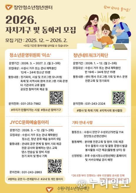 (누리일보) 수원시청소년청년재단 장안청소년청년센터는 2025년 12월 16일부터 청소년 수련시설 및 지역사회의 변화를 이끌어갈 청소년과 청년 지원자를 모집한다.