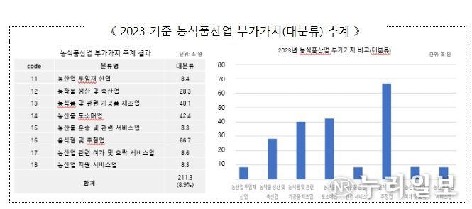 그간 농업 부가가치는 주로 쌀·채소·과일·축산업 등 1차 생산물 중심으로 집계되어 전 산업의 1% 수준에 불과한 것으로 알려져 왔으나, 연구 결과에 따르면 투입재를 비롯한 농산물의 가공·포장·유통 등 연관 산업과 스마트농업, 반려동물산업 등 신산업을 포함하면 그 비중이 ’23년 기준으로 전체 산업의 8.9% 수준, 부가가치 규모도 211조 원에 달하는 것으로 나타났다.