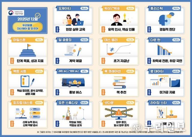 조사 결과 국민이 우리말로 바꾸어 써야 한다고 가장 많이 꼽은 외래 용어는 ‘오제이티’(76.6%)와 ‘빅샷/빅숏’(76.5%), ‘휴리스틱’(74.9%), ‘마일스톤’(74.1%), ‘딜 클로징’(73.5%)이었다. 이에 따라 ‘오제이티’는 ‘현장 실무 교육’으로, ‘빅샷/빅숏’은 ‘유력 인사’ 또는 ‘핵심 인물’로, ‘휴리스틱’은 ‘경험적 판단’으로, 업무 추진 단계에서 기준이 되는 ‘마일스톤’은 ‘단계 목표’ 또는 ‘성과 지표’로, 계약 성사 과정을 뜻하는 ‘딜 클로징’은 ‘계약 체결’로 이해하기 쉽게 다듬었다.