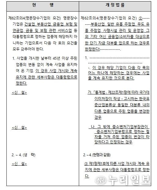 이에 따라 개정안은 일부 유흥·사행성 업종 등 일부를 제외하고, 건설업, 금융업, 보험업 등도 신청이 가능하도록 개선했다. 이를 통해 다양한 분야에서 모범적인 명문장수기업을 발굴할 수 있을 것으로 기대된다.