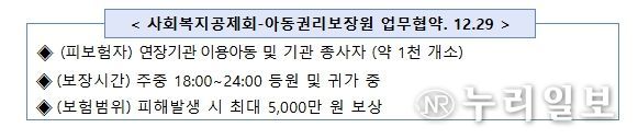 이번 야간 연장돌봄 사업에는 KB금융도 함께 참여한다. 복지부-KB금융 업무협약(’25.10.2.)을 통해 이번 사업 참여기관인 360개소를 포함한 전국 1천여 개 마을돌봄시설의 야간 시간대 이용아동과 종사자들의 안전을 함께 책임진다. 29일에는 사회복지공제회와 아동권리보장원이 업무협약을 맺어 연장기관 이용아동 및 기관 종사자를 대상으로 보험 가입 등을 지원할 예정이다.