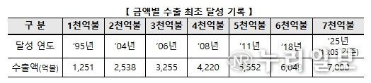 수출 7,000억 달러는 ‘18년도 6,000억 달러 달성 이후 7년만에 이뤄낸 쾌거로 전(全) 세계에서 6번째로 달성하며 수출강국 위상을 재확인했다. 특히, 6천억불은 7번째로 달성했으나, 7천억불은 6번째로 달성하며 우리 수출이 글로벌 주요국 대비 빠르게 성장하고 있음을 증명했다.