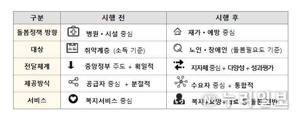 또한, 개별 사업별로 따로 신청하고 관리하던 구조에서, 시군구가 대상자의 돌봄 필요도를 파악하여 통합지원회의를 통해 계획을 세우고 서비스를 연계하는 수요자 중심 지원 체계로 전환된다.