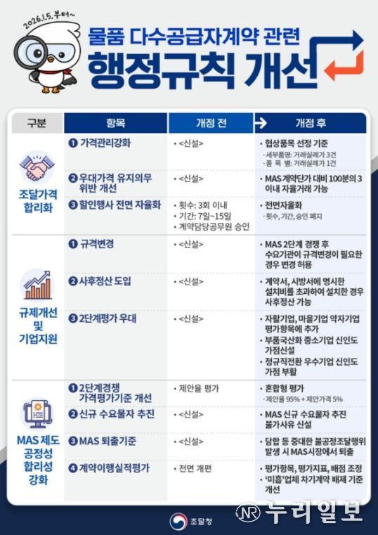 (누리일보) 조달청은 조달 가격의 신뢰성을 높이고, 공공조달에 남아 있는 불합리한 규제를 혁파하기 위해 '물품 다수공급자계약 관련 행정규칙 2종'을 개정하여 2026년 1월 5일부터 시행했다고 밝혔다.