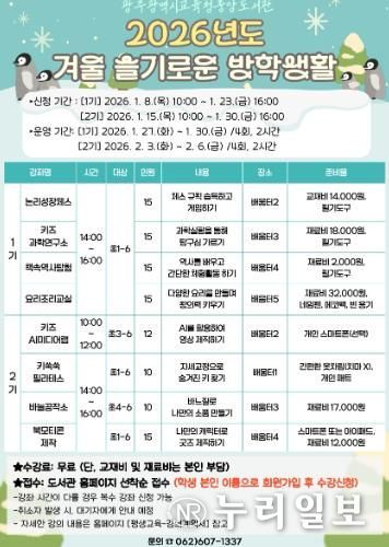 (누리일보) 광주시교육청중앙도서관은 겨울방학을 맞아 오는 27일부터 2월 6일까지 초등학생을 대상으로 ‘겨울 슬기로운 방학생활’을 운영한다.