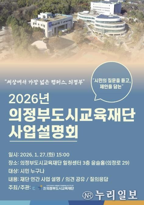 (누리일보) 의정부도시교육재단은 1월 27일 오후 3시, 재단의 연간 사업 방향을 시민들과 공유하고 의견을 나누기 위한 '2026년 의정부도시교육재단 사업설명회'를 개최한다.