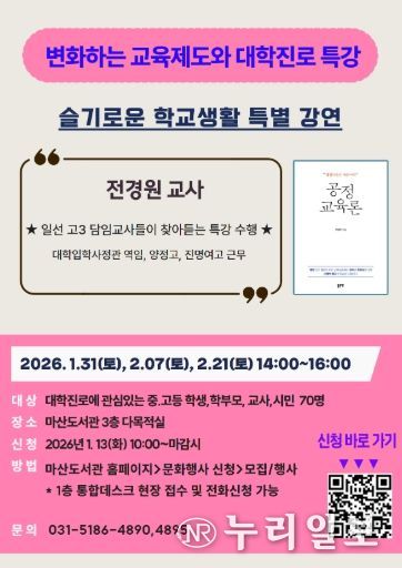(누리일보) 김포시 마산도서관이 1월 31일, 2월 7일, 2월 21일 2월 21일 3회에 걸쳐 오후 2시부터 4시까지 ‘변화하는 교육환경(슬기로운 학교생활)’에 관심이 있는 중고등학교 학부모, 교사, 학생 등 김포시민을 대상으로 특별강연을 운영한다.