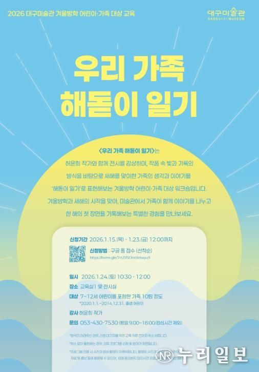 (누리일보) 대구문화예술진흥원 대구미술관은 겨울방학을 맞아 1월 24일 오전 10시 30분, 어린이·가족 대상 교육 프로그램 ‘우리 가족 해돋이 일기’를 운영한다.