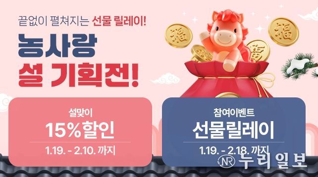 (누리일보) 충남도 대표 농특산물 온라인 쇼핑몰 충남농사랑이 한 해의 시작을 알리는 설 명절을 맞아 도내 농특산물의 소비 촉진, 지역 농가의 소득 증대와 함께 도민의 합리적이고 건강한 소비를 위해 19일부터 2월 10일까지 설 명절 기획전을 진행한다.