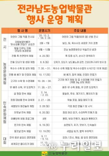 김옥경 전남농업박물관장은 “2026년은 박물관이 농업과 문화를 잇는 융합 플랫폼으로 한 단계 더 나아가는 해가 될 것”이라며 “단순히 농경문화의 가치를 지키는 데 그치지 않고, 오늘의 일상에서 새롭게 살아 숨 쉬게 하는 것이 박물관의 역할”이라고 말했다. 이어 “전통의 뿌리를 바탕으로 미래를 준비하는 ‘열린 K-헤리티지 박물관’으로서 지역민과 방문객 모두가 전남 농경문화의 가치와 매력을 함께 느끼도록 힘쓰겠다”고 강조했다.