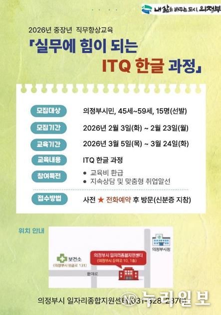 (누리일보) 의정부시는 2026년 중장년 직무향상교육의 일환으로 ‘실무에 힘이 되는 ITQ 한글 과정’ 참여자를 모집한다.