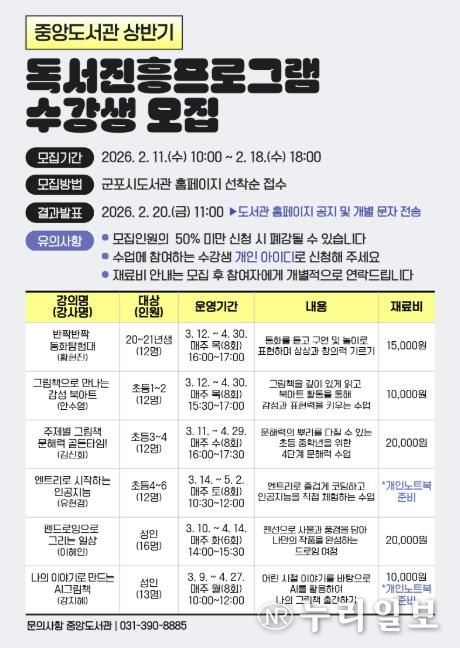 (누리일보) 군포시 중앙도서관은 다가오는 3월 시민들의 독서역량 개발과 지속적인 독서활동을 고취하기 위해 상반기 독서진흥프로그램을 운영한다.