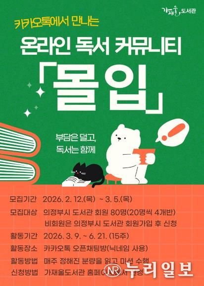 (누리일보) 의정부가재울도서관은 3월 9일부터 6월 21일까지 총 15주 동안 운영하는 온라인 독서챌린지 ‘몰입’의 8기 참여자를 모집한다.
