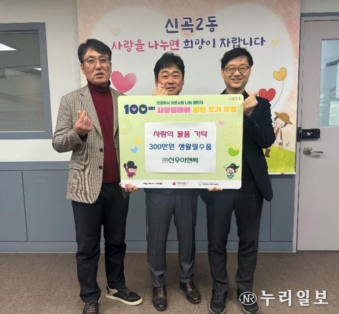 (누리일보) 의정부시 신곡2동주민센터는 2월 3일 ㈜신우이엔씨가 총 300만 원 상당의 생활필수품(세탁세제‧샴푸‧비누 등)을 기탁하며 ‘100일간 사랑릴레이 배턴 잇기’에 동참했다고 밝혔다.