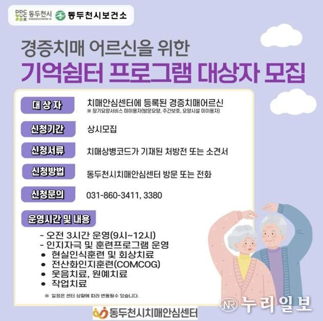 (누리일보) 동두천시치매안심센터는 경증 치매 환자를 대상으로 ‘기억쉼터 프로그램’ 1기 참여자를 모집한다고 밝혔다. 프로그램은 2026년 3월 9일부터 5월 12일까지 운영된다.