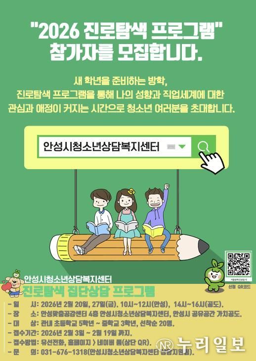 (누리일보) 안성시청소년상담복지센터는 오는 2월 20일과 27일, 2일간 청소년을 대상으로 ‘겨울방학 프로그램 – 진로탐색’을 운영한다고 밝혔다.