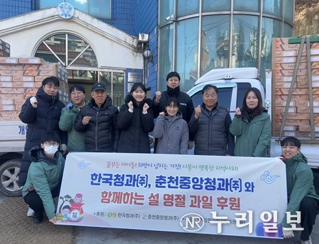 (누리일보) 한국청과(주)와 춘천중앙청과(주)(대표이사 박상헌)는 다가오는 설 명절을 맞아 강원특별자치도 내 위탁가정이 보다 따뜻하고 풍성한 명절을 보내길 바란다며, 2월 9일 강원가정위탁지원센터에 과일 400박스(약 2,000만 원 상당)를 후원했다.